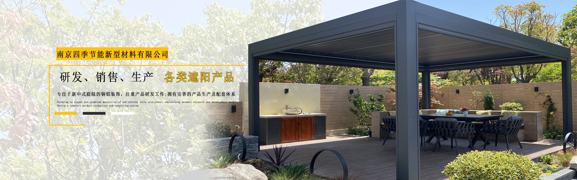 南京四季節能新型材料有限公司是一家集研發、設計、銷售、生產、安裝、售后于一體企業。業務范圍:帶燈智能翻板涼亭,電動防水折疊天幕篷,環保遮陽簾,綠化和金車棚,鋁合金雨棚,電動防風卷簾等。公司專注于新中式庭院的銅鋁裝飾,注重產品研發工作。同時擁有完善的產品生產及配套體系,秉承“品質、專注”的理念,為客戶提供高品質服務。我們期待與您攜手,共創未來!